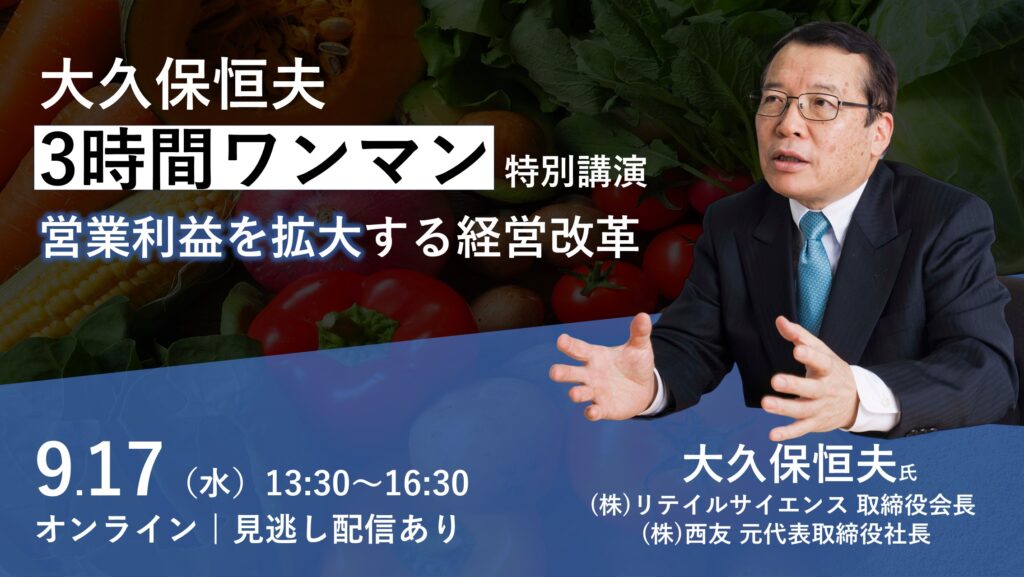 みなさま、こんにちは。2025年9月17日に開催しましたAI流通革命3.0ウェビナー大久保恒夫3時間ワンマン特別講演「小売業の営業利益を拡大する経営改革」についてご報告いたします。