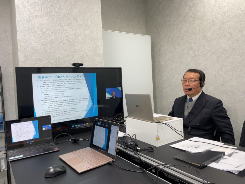 冒頭に、株式会社リテイルサイエンス 取締役会長 大久保恒夫より「今日の研究会のポイント」をお話ししました。引き続き、大久保より「ネットスーパー成功の本質」と題し、講演を行いました。ネットスーパーの顧客ニーズはリアル店舗とは異なり、「忙しくても確実に商品が届く利便性」に価値を見出す層が中心であること、そのニーズに対応するためには、安売りではなく粗利率を高めた商品構成と価格設計が不可欠であることを説明しました。また、ネットスーパーは社会貢献ではなく事業であり、リアル店舗よりも高い営業利益率を目指すべきであると強調しました。OMOの考え方のもと、店舗在庫・設備・人員を活用し、リアルとネットを一体で成長させる重要性が示されました。